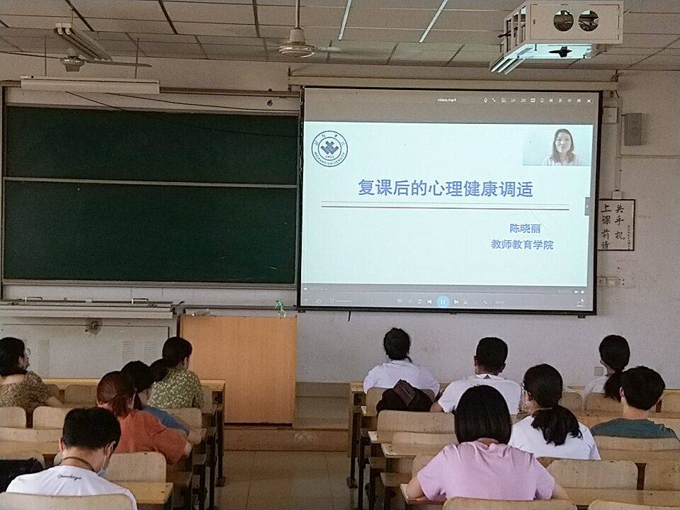 针对返校学生返校后的实际,为鼓励和引导他们以积极的心态投入到学习、生活中去,6月2日至8日,学生工作处、教师教育学院共同举办了《复课后的心理健康调适》专题讲座。