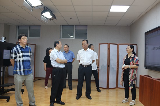 随后,在党总支书记吴明、院长耿建民、党总支副书记尹翔以及学院实验室负责老师的陪同下,先后参观了教师教育学院的智慧教室、虚拟讲堂、创作综合实验室和“三字一画”大课堂等特色实验室。在虚拟课堂实验室,耿建民亲自展示了虚拟课堂的使用方法,丁子信对教师教育学院的现代化教学设施建设给予了很高评价,提出要积极利用,实现资源共享,让这些设备更好地服务于教学和学生素质培养,最大限度地发挥其使用价值。