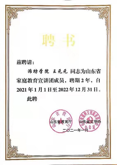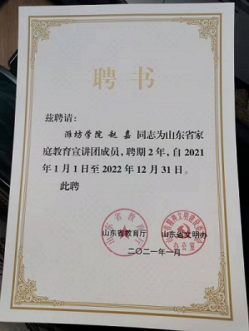 日前,山东省家庭教育志愿服务总队办公室发函,我院教师赵嘉、王元元受聘为山东省家庭教育宣讲团成员,并发放聘书。