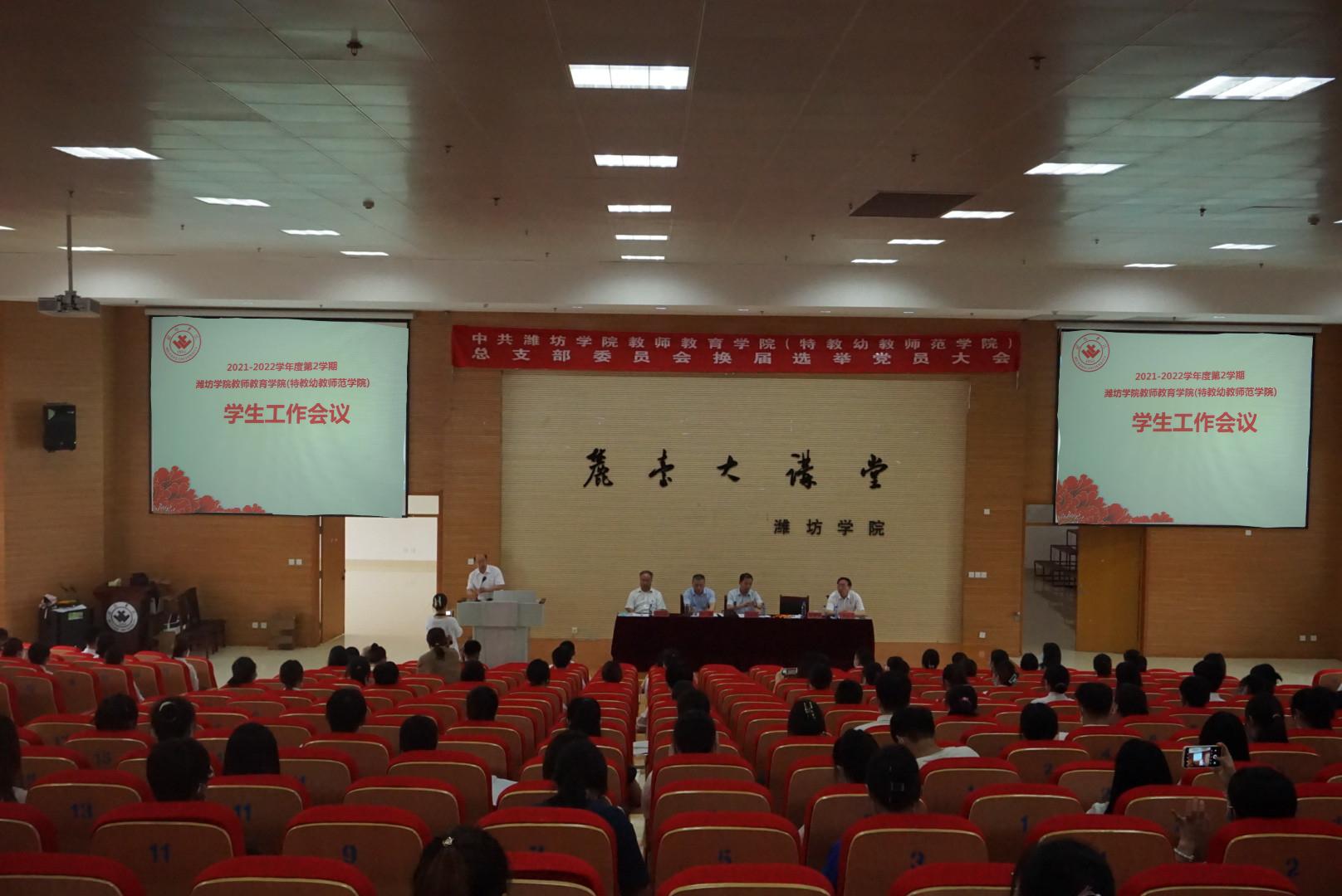 为全面加强学生工作队伍建设,增强学生管理的凝聚力、向心力和战斗力,促进良好校风学风教风的形成。6月5日,在3号教学楼四楼报告厅召开了教师教育学院(特教幼教师范学院)2021—2022学年度第二学期学生工作会议。出席本次会议的有党总支书记马继武、院长魏晨明、党总支副书记尹翔、副院长董守生、倪烈宗,全体辅导员和学生会骨干、各班班长、团支书。