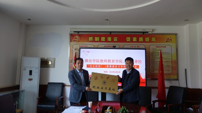 在潍坊盲校、潍坊聋哑学校,马继武一行实地参观了学校教学设施和特色课程,听取了学校办学特色介绍。双方均表示珍惜合作机会,切实提高实习生育人质量,在未来的学校发展中,加强合作。实习生在交流发言中,表达了对实习学校和学生的热爱与关心,以及产生的深深感情;同时,实习学校也对实习生的教育实习工作表示非常满意。为了更好地实现合作前景,双方签署了合作协议并举行了“潍坊学院就业实习基地”揭牌仪式。
