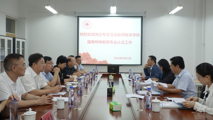 本网讯 9月23日,我校邀请4名专业认证评估专家对特殊教育、美术等5个师范专业进行模拟现场考察,特殊教育专业现场考察在安顺校区6303会议室举行,会议由王承端校长主持,教师教育学院相关人员参加。