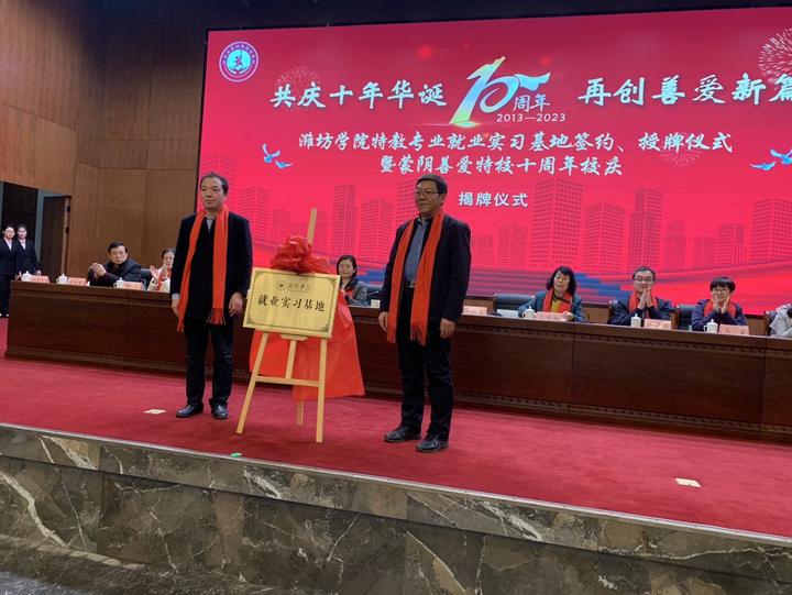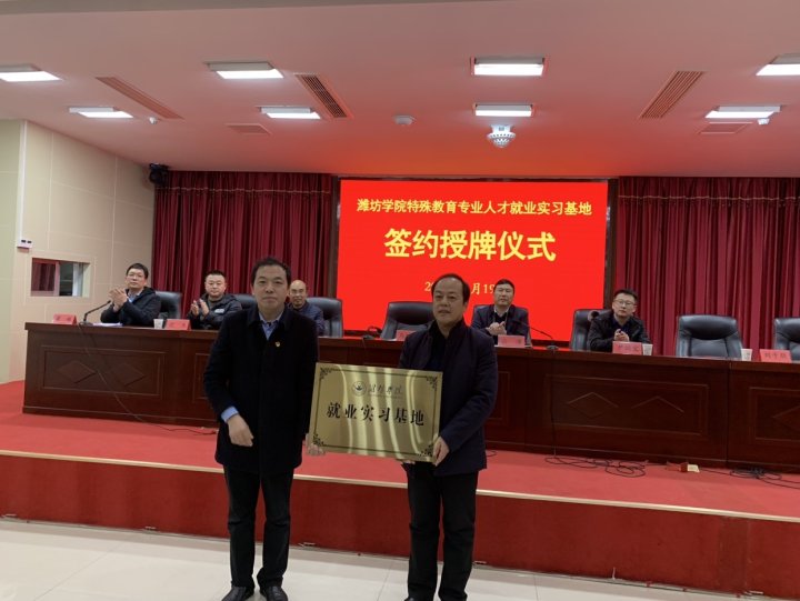 为了更好地实现合作前景,双方签署了合作协议并举行了“潍坊学院就业实习基地”授牌仪式。马继武强调希望双方以本次签约授牌仪式为契机,坚持优势互补、互惠互利、共同发展,进一步加强特殊教育的交流合作,共同提升人才培养的质量水平,为特殊教育的高质量发展奠定坚实的基础。
