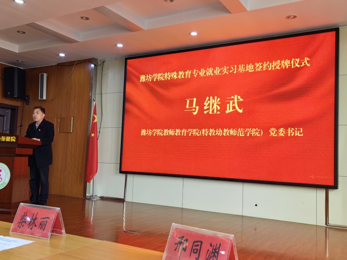 为了更好地实现合作前景,双方签署了合作协议并举行了“潍坊学院就业实习基地”揭牌仪式。马继武强调希望双方以本次签约为契机,坚持优势互补、互惠互利、共同发展,进一步加强特殊教育的交流合作,共同提升人才培养的质量水平,为特殊教育的高质量发展奠定坚实的基础。