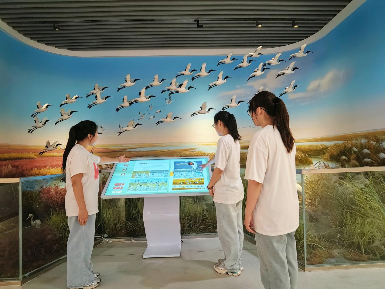 活动首日,实践队走进东营市黄河文化博物馆,围绕环保主题拍摄手势舞《阳光下的心愿》,让绿色文明在互动中浸润。在“黄河生态变迁”展区,队员们凝视生态链图谱,借动态沙盘感受黄河三角洲湿地演化;于“治黄成就”旁的石油发展板块,了解东营从石油城向绿色城市的蜕变历程,深刻体会生态与发展协同推进的坚守与智慧。之后,队员们又在东营市黄河文化馆,通过图文、实物与多媒体,了解黄河历史变迁、东营段生态保护成果及挑战,深化对“黄河宁,天下平”的认知,将生态保护理论与实践调研深度融合。