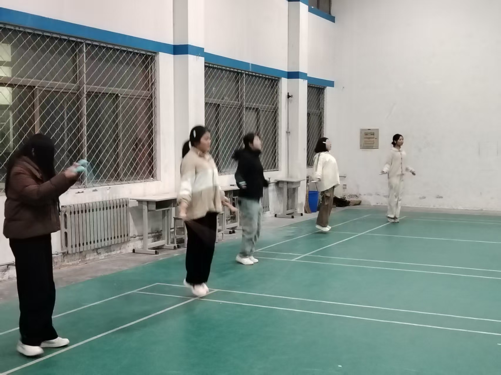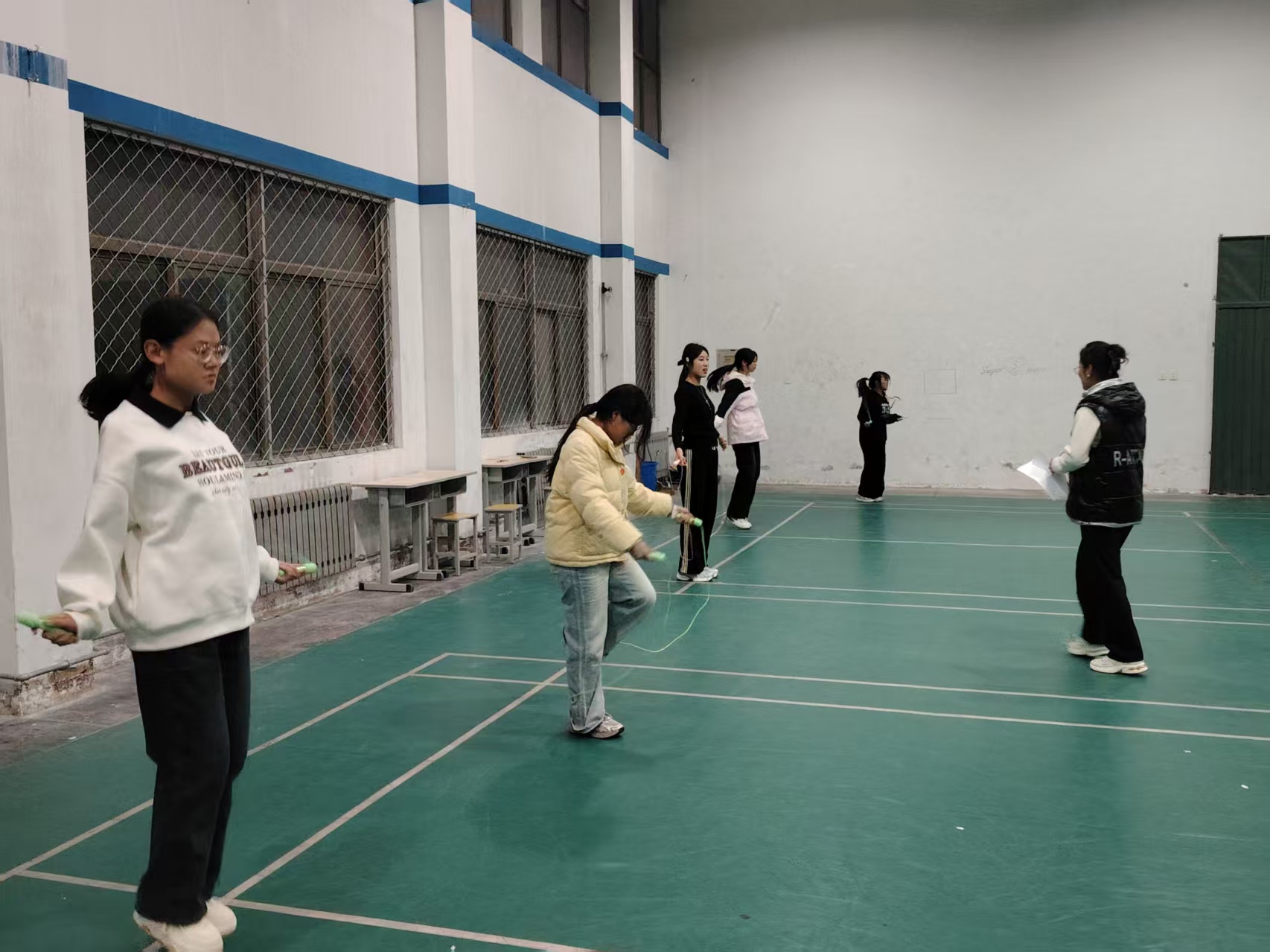 下午17:50,参赛同学与志愿者陆续到场,体育馆内很快响起跳绳挥动的簌簌声——有人轻车熟路地提速热身,有人反复调整节奏适应绳长,彼此间的交流声让现场氛围渐趋热烈。