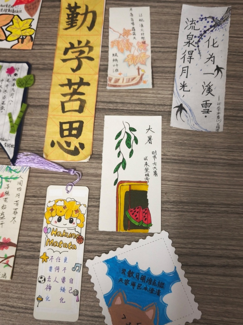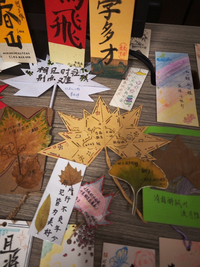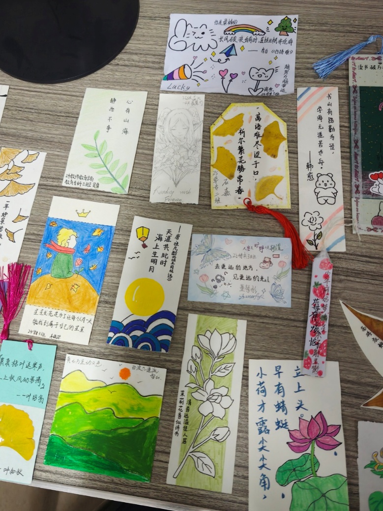 在创作环节,同学们充分发挥想象力与创造力,有的选择古典诗词作为书签内容,如“腹有诗书气自华”“书山有路勤为径”等;有的绘制山水、花鸟、人物等传统图案;有的结合专业特色,融入古典文化元素,设计出独具创意的个性化书签。制作过程中,大家相互交流、彼此启发,现场气氛热烈而温馨。
