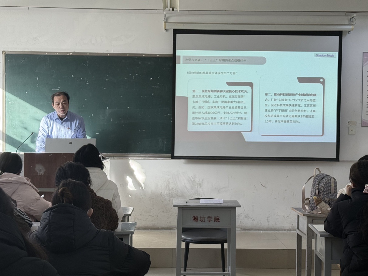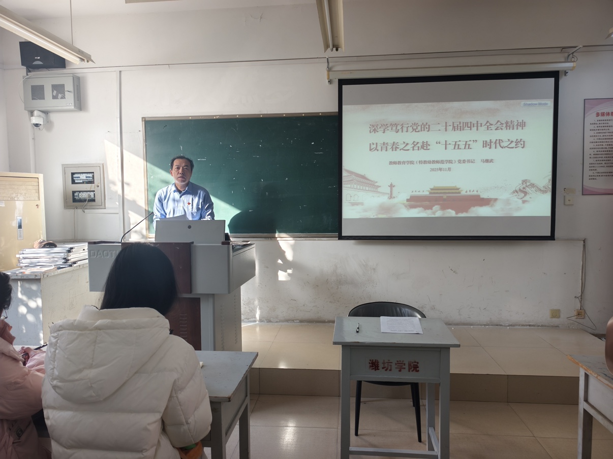 本网讯 为深入学习宣传贯彻党的二十届四中全会精神,引导青年学生深刻把握“十五五”时期国家发展蓝图,11月21日,学院党委书记马继武以“深学笃行党的二十届四中全会精神,以青春之名赴‘十五五’时代之约”为题,为学生讲授思想政治理论课暨党的二十届四中全会精神形势政策报告,学院全体在校入党积极分子、中共党员(含预备党员)参与学习。