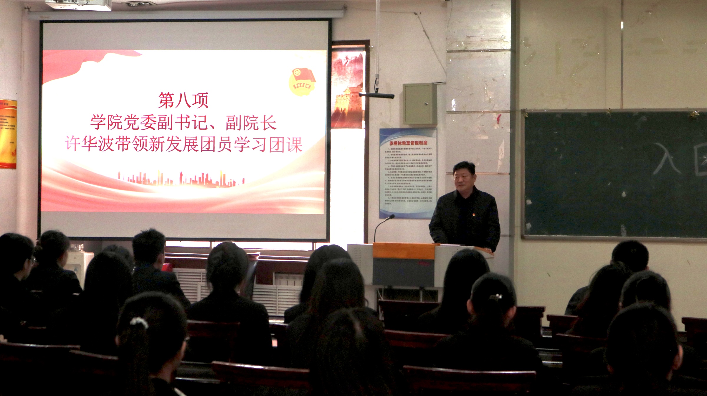 仪式以全体师生齐唱国歌开场,此次仪式由邵启鼎老师主持,随后杨兴宇同学宣读新发展团员名单。团员代表苗一凡同学带领新团员庄严宣誓,全体新团员面向团旗,庄严宣誓。入团介绍人耿新怡同学宣读团章中团员义务与权利条款,明确了团员的责任与使命。新团员代表张欣同学分享入团感悟与承诺,老团员代表李莹同学分享了个人成长经历并发出传承奋斗的倡议。团委负责人李明蔚对新团员提出坚定理想信念、勤学修德、勇于实践的期望。最后学院党委副书记许华波为新团员讲授“入团初心,强国我行”团课,用生动的案例引导新团员们理解“初心”的分量,现场的新团员们都听得格外专注。随着熟悉的团歌旋律响起,全体师生起身合唱,整齐的歌声里,这场庄重而温暖的入团仪式缓缓落下帷幕。