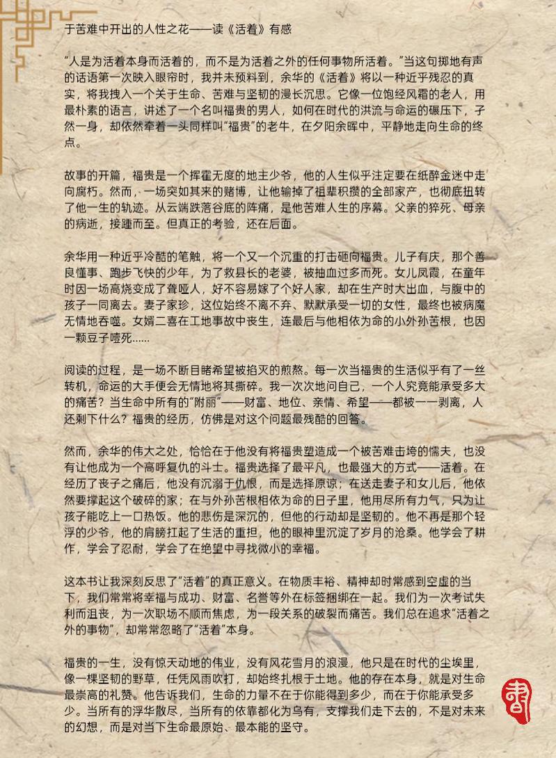 本次活动中涌现出一批内容深刻、感悟独到的优秀读书作品。来自2025级应用心理学二班安明扬、吴金泽、臧甫呈等同学,以其清晰的逻辑、真挚的情感与深度的思考,展现了当代大学生勤于阅读、善于思考的良好风貌。这些优秀作品紧扣主题,既有对经典著作的当代解读,也有对现实生活的阅读反思,为活动现场提供了丰富的讨论素材,也激励着更多同学投身于深度阅读之中。