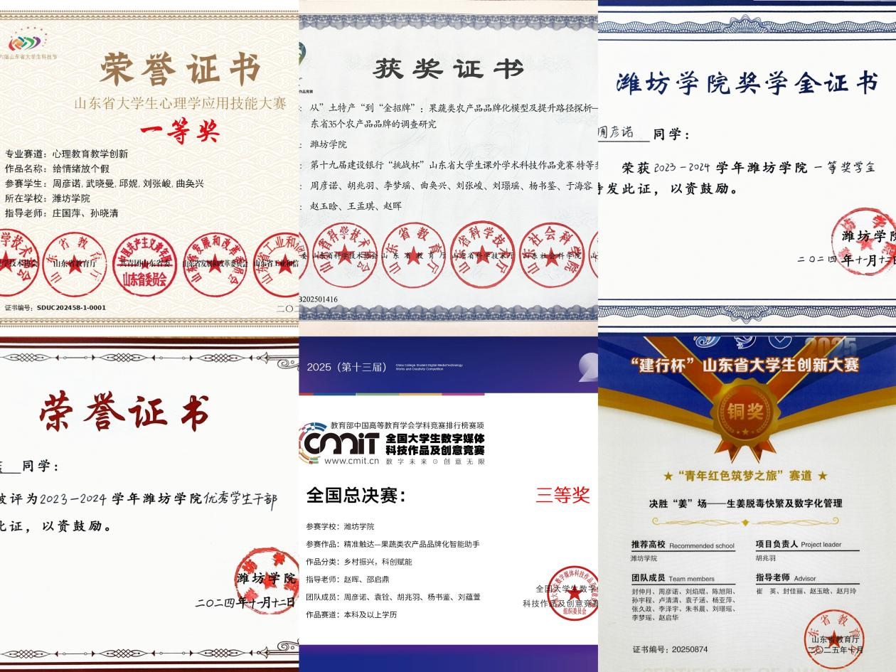 如果说学业是她沉稳的根基,那么科技创新竞赛就是她展翅翱翔的天空。在校期间,她获得第十九届挑战杯山东省大学生课外学术科技作品竞赛省级特等奖、2025年中国国际创新大赛省级铜奖、第十三届全国大学生数字媒体科技作品及创意竞赛国家级三等奖,第二届大学生新文科实践创新大赛国家级铜奖、山东省大学生心理学应用技能大赛一等奖等多项国家级、省级竞赛奖项,大学生创新创业训练计划获省级立项。不仅锤炼了的专业技能与抗压能力,更使她深刻体会到团队协作与知行合一的强大力量。