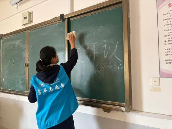 活动伊始,同学们便怀着期待与热忱有序抵达集合点,在工作人员的耐心引导下,依次抽取公益盲盒任务、领取印有活动标识的志愿服。大家带着随机解锁的“雷锋任务”,化身春日校园里的志愿微光,穿梭于教学楼、操场与校外街巷之间:将随意停放的共享单车逐一归位至指定区域,让原本杂乱的出行通道重归整洁通畅;仔细擦拭教室黑板上的粉笔痕迹,细致整理讲台与课桌椅,为师生们营造出清爽舒适的学习空间;还有同学主动捡拾路边垃圾、帮扶来往师生,用举手之劳传递善意。这些微小却充满力量的行动,正是对雷锋精神最生动的诠释,让“奉献、友爱、互助、进步”的志愿精神在校园里悄然流淌。